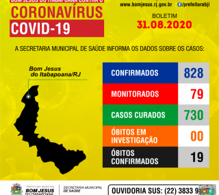 O município de Bom Jesus do Itabapoana registrou, em 24 horas, mais sete casos de Covid-19, somando, nesta segunda-feira (31), 828 casos confirmados, dos quais 19 resultaram em óbito dos pacientes.