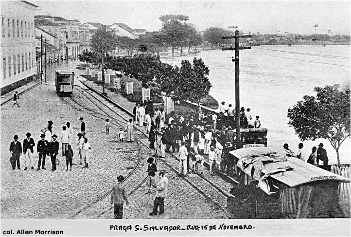 Dois bondes elétricos no lado leste da Praça São Salvador em frente ao belo prédio da sede da Sociedade Musical Lira de Apolo. O bonde visto parcialmente no canto direito da imagem parece ser um modelo de carga. Os automóveis e roupas sugerem 1920, mas o cartão postal foi enviado em 1928