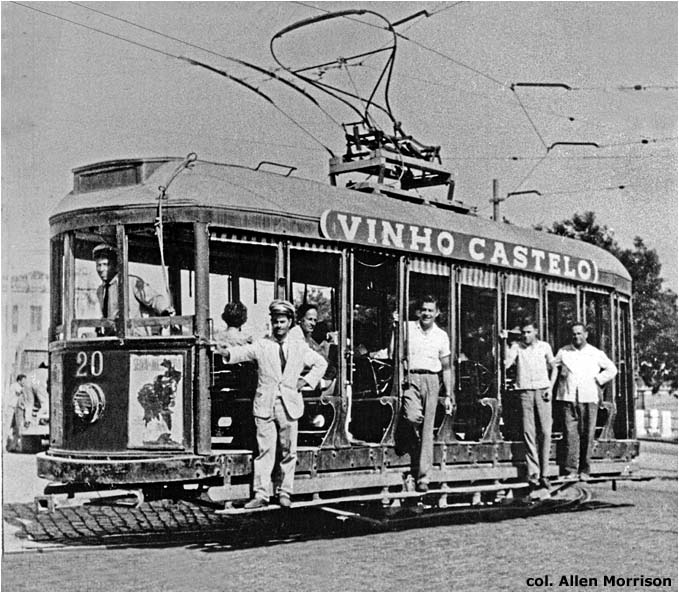 Um flagrante feliz do bonde número 20. Nota-se já a presença dos fios duplos dos ônibus elétricos (trólebus)