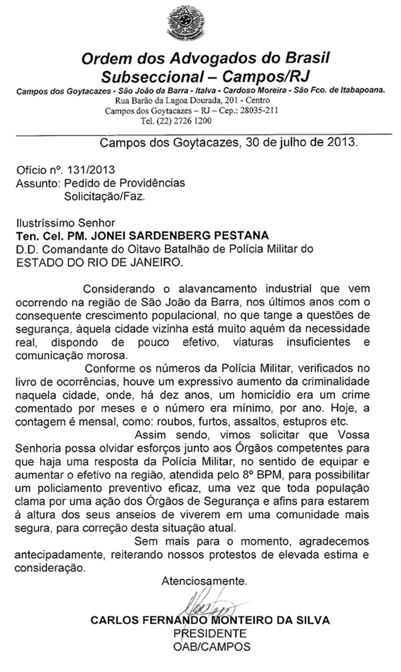 Na verdade, foram dois os ofícios encaminhados neste sentido pelo presidente da OAB local, Carlos Fernando Monteiro da Silva, o Guru. O primeiro, de 30 de julho de 2013, endereçado ao comando do 8º Batalhão de Polícia Militar (BPM), no qual foi alertado: