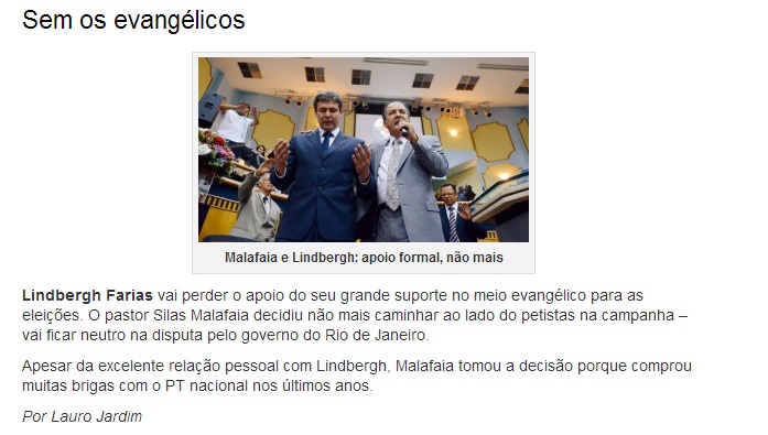 O pré-candidato ao governo do estado, senador Lindbergh Farias (PT), não terá mais o apoio do pastor Silas Malafaia, que seria o maior cabo eleitoral do petista para atrair votos do segmento evangélico. Leia nota da coluna Radar Online, de Lauro Jardim: