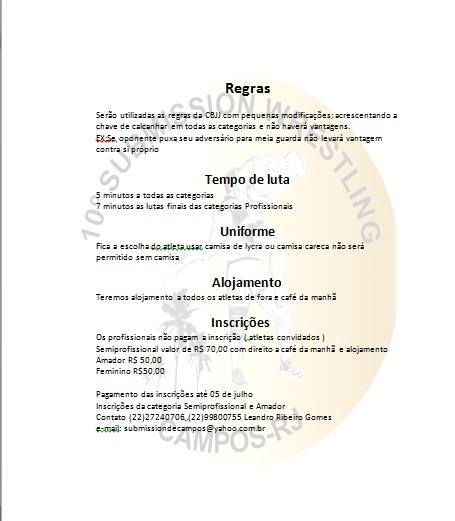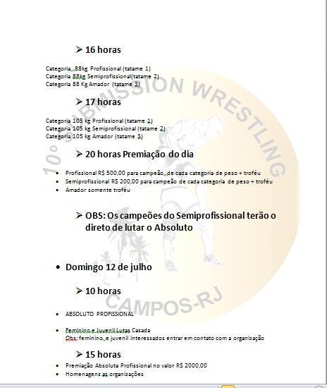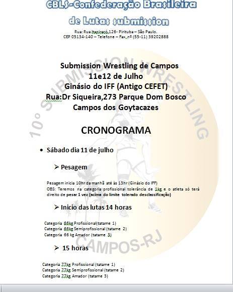 Nos dias 11 e 12 de Julho próximos, no Ginásio do IFF-( Antiga Escola Técnica Federal), em Campos dos Goytacazes-RJ, acontece mais uma competição de SW, totalmente legal, dentro das normas da CBLS- Confederação Brasileira de Lutas Submission. Veja o cronograma abaixo, participe ou leve alguém para lutar. O organizador do evento, Leandro Ribeiro Gomes , pioneiro do esporte na região, faixa-preta de Jiu-Jitsu e entusiasta das artes marciais, entra de cabeça em mais um certame de sucesso como sempre. O BNB apóia e vai fazer a cobertura.