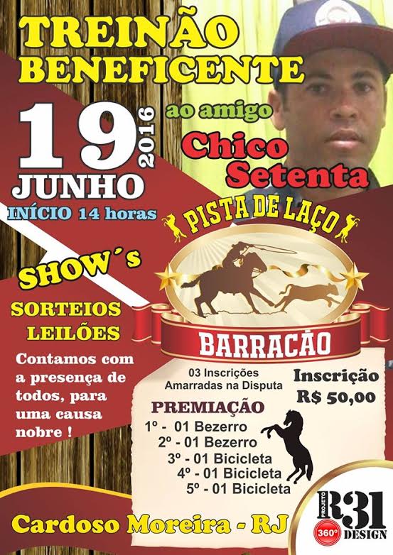No próximo domingo 19 de junho, será realizado na Pista de Laço Barracão, a partir das 14h, o Treino de Laço Beneficente para o amigo
