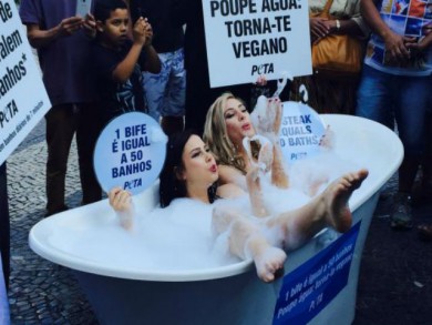 A produção de um bife demanda quantidade de água equivalente a 50 banhos de banheira. E para chamar a atenção sobre esse desperdício, duas mulheres nuas tomaram banho de banheira nesta quinta-feira (4) no Largo da Carioca, no centro do Rio de Janeiro. O vento frio não desanimou as militantes da ONG People for the Ethical Treatment of Animal (Peta), que ficaram cerca de uma hora na banheira segurando placas em defesa do veganismo, dieta que exclui o consumo de qualquer produto de origem animal.