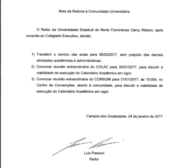 Por meio de nota oficial, a reitoria da Uenf adiou o retorno das atividades acadêmicas em uma semana - a previsão é de retorno no dia 06 de fevereiro, mas essa data ainda pode mudar. Esta decisão tem por principal objetivo permitir que o Conselho Universitário (Consuni), que tem reunião marcada para a próxima terça-feira (31), possa analisar e deliberar sobre as condições para retorno das aulas. A instituição está com o calendário atrasado, com o início do segundo semestre de 2016 ainda pendente.