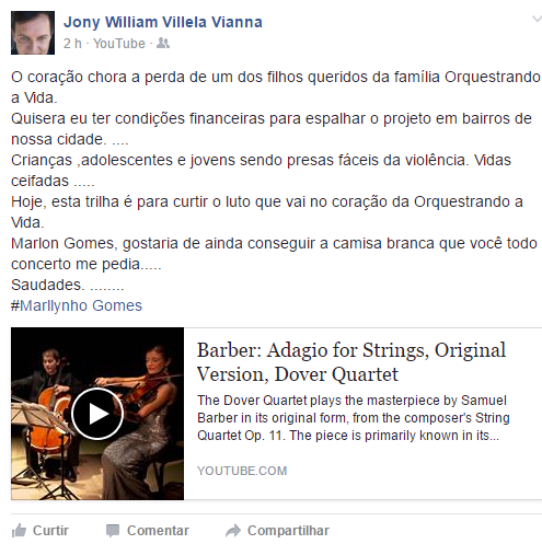 Em sua página em uma rede social o presidente da ONG, Jony William Villela Vianna, lamentou a morte do jovem. “O coração chora a perda de um dos filhos queridos da família Orquestrando a Vida. Quisera eu ter condições financeiras para espalhar o projeto em bairros de nossa cidade… Crianças, adolescentes e jovens sendo presas fáceis da violência. Vidas Ceifadas. Hoje, esta trilha é para curtir o luto que vai no coração da Orquestrando a Vida. Marlon Gomes, gostaria de ainda conseguir a camisa branca que você a todo concerto me pedia. Saudades”, escreveu Jony Willian.