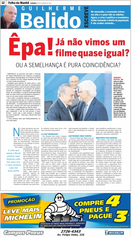 Para refletir e não deixar este texto ainda mais longo do que o suportável num domingo de verão: 1) Renan, réu no Supremo e carregando mais uma dúzia de inquéritos, cumpriu até o último minuto o mandato de presidente do Congresso; 2) Depois de emplacar aliados nas Presidências do Senado e Câmara, o governo Temer vai abandonando a promessa de cortar 10 ministérios (criticava abertamente os 32 de Dilma) e cria mais dois, que com o da Cultura chega a 28. Logo, apenas 4 a menos que a antecessora. 4) E, para fechar, nomeou Moreira Franco, citado em delação da Lava Jato, para a Secretaria-Geral da Presidência da República, criada com status de ministério e conferindo ao titular foro especial por prerrogativa de função, o chamado “foro privilegiado”.