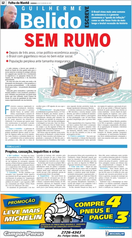 Fevereiro começou registrando retrocessos econômicos, desdobramentos da Lava Jato e o governo Michel Temer, ao melhor estilo Dilma, aumentando o número de ministérios e conferindo foro privilegiado ao amigo Moreira Franco, três dias depois de seu nome aparecer em delações da Odebrecht. E na semana que passou mais elos continuaram se juntando à pesada corrente que não deixa o Brasil zarpar, a saber: