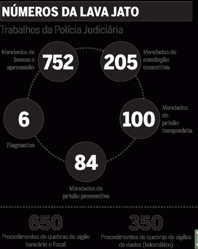 E ultrapassou fronteiras: foram firmados mais de 150 acordos internacionais para troca de provas sobre corrupção e lavagem de dinheiro: Estados Unidos, Canadá, Panamá, República Dominicana, Guatemala, Uruguai, Peru, Ilhas de Man, Andorra, Alemanha, Dinamarca, Suíça, Suécia, Rússia, Macau, China, Cingapura, Hong Kong, entre outros. Megaempresários como Marcelo Odebrecht, herdeiro da, então, maior construtora do País, Otávio Marques de Azevedo, ex-presidente da Andrade Gutierrez também estão entre os presos. (S.M.) (A.N.)