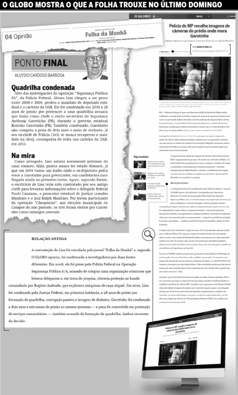 A suposta reedição da parceria entre Anthony Garotinho e o ex-chefe de Polícia Civil, Álvaro Lins, aventada na coluna Ponto Final, da Folha da Manhã, na edição do último domingo, levou a Polícia do Ministério Público Estadual ao apartamento onde mora o ex-governador, no Rio de Janeiro. Policiais do Grupo de Apoio aos Promotores (GAP) do MP recolheram imagens de câmeras de segurança do prédio onde ele mora, no Flamengo. A medida, determinada pela Justiça Eleitoral de Campos, foi para verificar se Garotinho se reuniu com Lins, seu aliado político. A informação foi dada pelo jornal O Globo, que citou a nota da Folha. Em princípio, foi divulgado que a apreensão teria ocorrido, também, em empresas que teriam Garotinho como sócio, mas sua defesa negou. Não se manifestou, porém, a respeito da busca no prédio, nem da suposta contratação de Lins.
