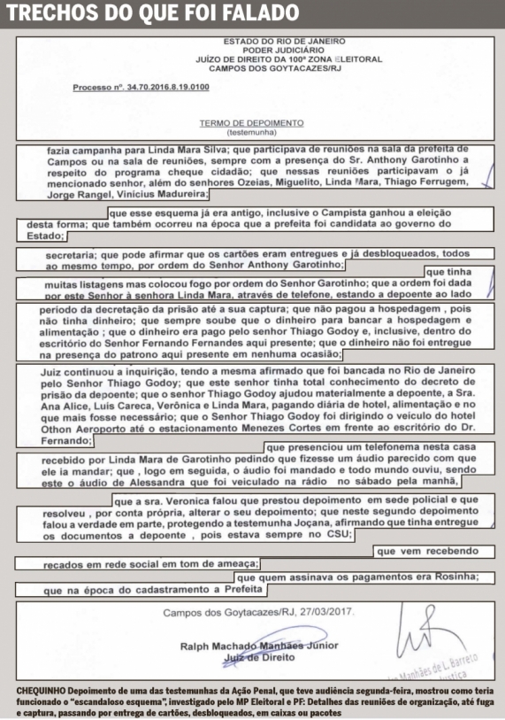 O depoimento da testemunha-chave no caso Chequinho, a radialista Elizabeth Gonçalves, a Beth Megafone, detalhou como teria funcionado o “escandaloso esquema” do uso político do Cheque Cidadão. Beth falou por mais de três horas, na tarde dessa segunda-feira (27), ao juiz Ralph Manhães, na presença de representantes do Ministério Público Eleitoral (MPE) e de advogados, entre eles, o defensor do ex-governador Anthony Garotinho (PR), Fernando Fernandes. Beth afirmou, por exemplo, que colocou fogo em documentos “por ordem do senhor Anthony Garotinho” e que os cartões, nesse período, vinham desbloqueados também por ordem dele. O depoimento aconteceu na Ação Penal que tem como réus os vereadores eleitos e não diplomados Ozéias (PSDB) e Miguelito (PSL), além da ex-secretária de Desenvolvimento Humano e Social Ana Alice Alvarenga e a ex-coordenadora do Cheque Cidadão Gisele Koch. Na esfera eleitoral, são esperadas para os próximos dias as sentenças das ações de Investigação Judicial Eleitoral (Aije) que têm os suplentes de vereador Geraldinho de Santa Cruz (PSDB) e Carlinhos Canaã (PTC) como réus. Nessa terça-feira, Garotinho sofreu mais uma derrota: teve negada a liminar dentro do habeas corpus impetrado contra a apreensão de imagens de câmera de segurança do apartamento onde mora, no Rio.