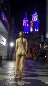 Como a área está deserta, deduz-se que seja madrugada. O relógio da Catedral Diocesana até aparece. Mas não dá para identificar a hora, mesmo porque há meses o aparelho não funciona. O fato é que, sem curiosos para interpelá-la, a peladona caminha tranquila, descalça, leve, solta...