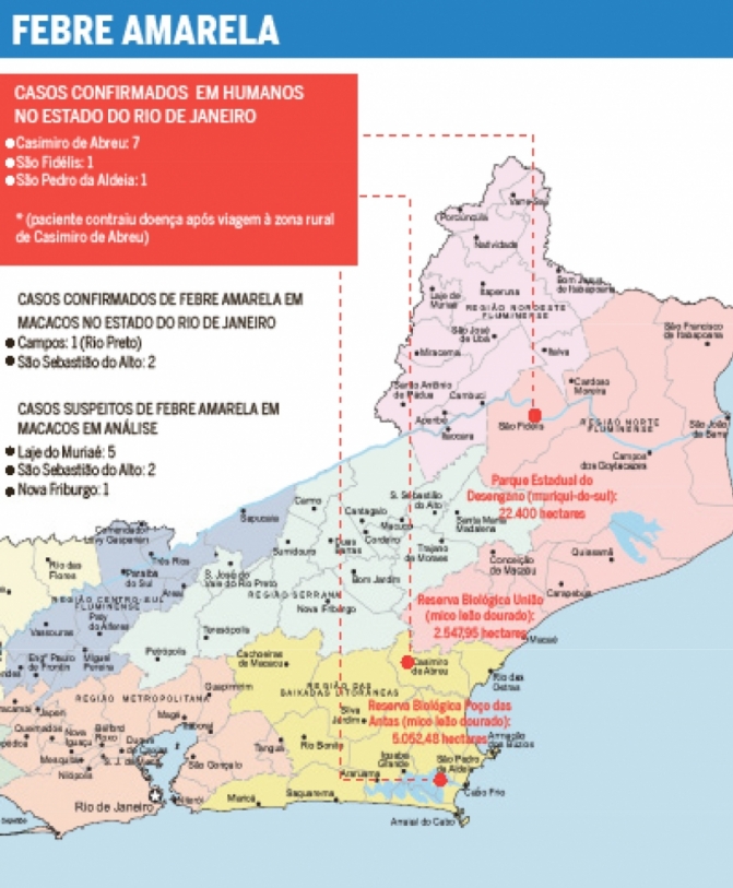 Em Casimiro de Abreu, onde já foram registrados sete casos de febre amarela, incluindo uma morte, a preocupação ambiental é com outra espécie de primata. O município fica entre as reservas biológicas União e Poço das Antas, últimos refúgios no mundo inteiro do mico leão dourado. Segundo a ONG de preservação ambiental WWF, são estimados que apenas 3 mil animais da espécie que se tornou símbolo da preservação ainda vivam na região.