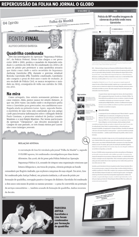 A suposta contratação do escritório de Lins para investigar a vida do juiz Ralph Manhães, o promotor Leandro Manhães e o delegado da Polícia Federal Paulo Cassiano, levou a Polícia do MPE ao apartamento onde mora o ex-governador, no Rio de Janeiro, como mostrou o site do O Globo, em 17 de março. A edição do jornal trazia a nota da Folha sobre o assunto.