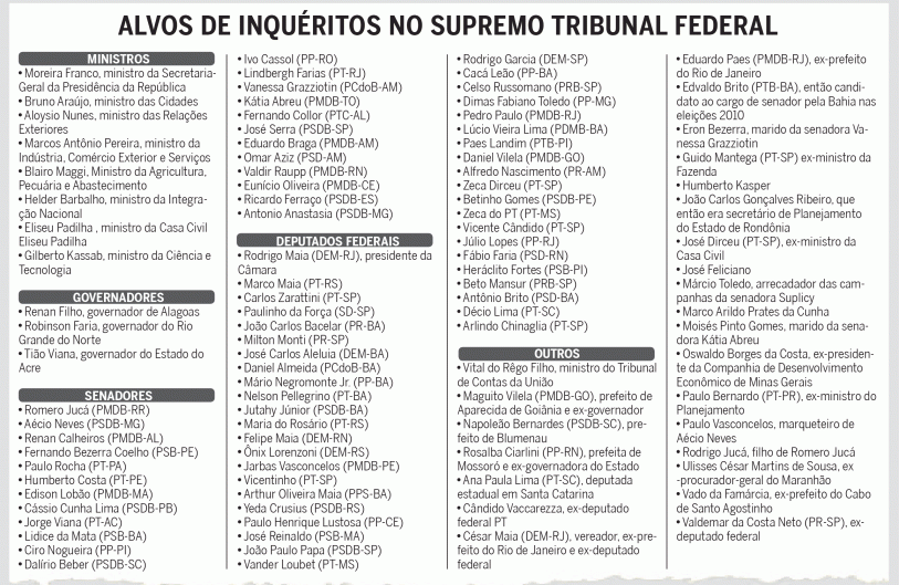 Entre os alvos de investigação estão os presidentes do Senado, Eunício Oliveira (PMDB-CE), e o da Câmara, Rodrigo Maia (DEM-RJ). Outros nomes do Rio sob investigação são os deputados federais Pedro Paulo (PMDB) e Júlio Lopes (PP), além do senador Lindbergh Farias (PT). César Maia (DEM) está no mesmo inquérito do filho. O ex-prefeito do Rio Eduardo Paes (PMDB), no mesmo inquérito de Pedro Paulo.