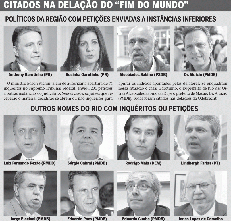 2010 - Assinatura de contrato com Rosinha e executivo da Odebrecht / DivulgaçãoA deleção do “fim do mundo”, dos executivos da Odebrecht, atingiu políticos com foro privilegiado, com 76 inquéritos autorizados pelo ministro Edson Fachin, relator da Lava Jato no Supremo Tribunal Federal (STF), mas também foi um duro golpe na carreira de políticos hoje sem cargo eletivo. Fachin determinou o envio, para outras instâncias do Judiciário, 201 petições, entre elas as que envolvem os ex-presidentes Luiz Inácio Lula da Silva (PT), Dilma Rousseff (PT) e Fernando Henrique Cardoso (PSDB). Da região, também há políticos sob suspeita de participação em irregularidades, como os ex-governadores Anthony Garotinho (PR) e Rosinha Garotinho (PR), o ex-prefeito de Rio das Ostras Alcebíades Sabino (PSDB), o ex-prefeito de Macaé Riverton Mussi (PDT) e o atual, Dr. Aluízio (PMDB). Os juízes que receberão o material decidirão se abrem ou não inquéritos para apurar os indícios apontados pelos delatores. O ministro ainda retirou o sigilo das delações.