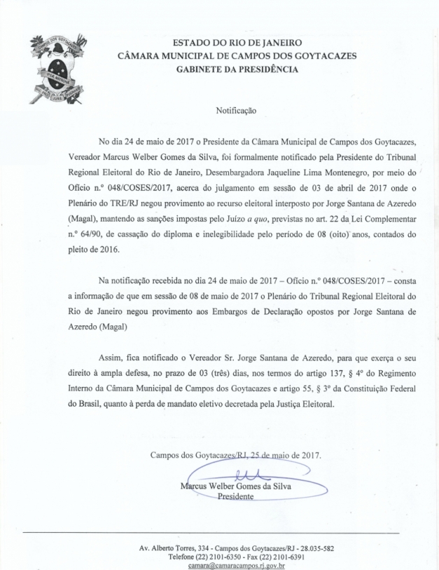 A Câmara emitiu hoje nota oficial sobre a notificação do Tribunal Regional Eleitoral (TRE) para que o vereador Jorge Magal seja afastado do Legislativo por já ter sido condenado no caso Chequinho em segunda instância.