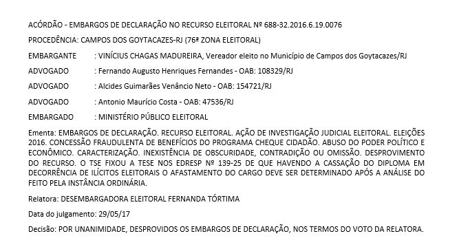 Está publicado no Diário Oficial, edição de amanhã, o acórdão dos Embargos de Declaração do vereador Vinicius Madureira (PRP). Ele teve a condenação confirmada pelo TRE no caso Chequinho.