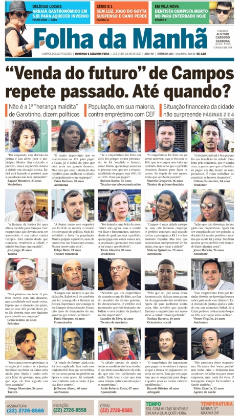 Com um pouco mais de consciência da gravidade do quadro, que pode ser modificada em desfavor de Campos a qualquer momento, os deputados estaduais e federal da cidade felicitaram a decisão momentânea da Justiça. Mas foi, sobretudo, nos depoimentos dos ex-prefeitos de Campos, ouvidos pela Folha sobre a questão, que ficou mais patente: os Garotinho (PR) não legaram o caos financeiro apenas ao governo Rafael Diniz (PPS). Na verdade, desde o primeiro mandato de Anthony Garotinho como prefeito de Campos (1989/92), a despeito da população, eles sempre fizeram isso. Quem dúvida tiver, que leia o artigo do jornalista Ricardo André Vasconcelos, primeiro secretário de Comunicação de Garotinho, publicado na página 4 da edição do jornal Folha da Manhã deste domingo (23).