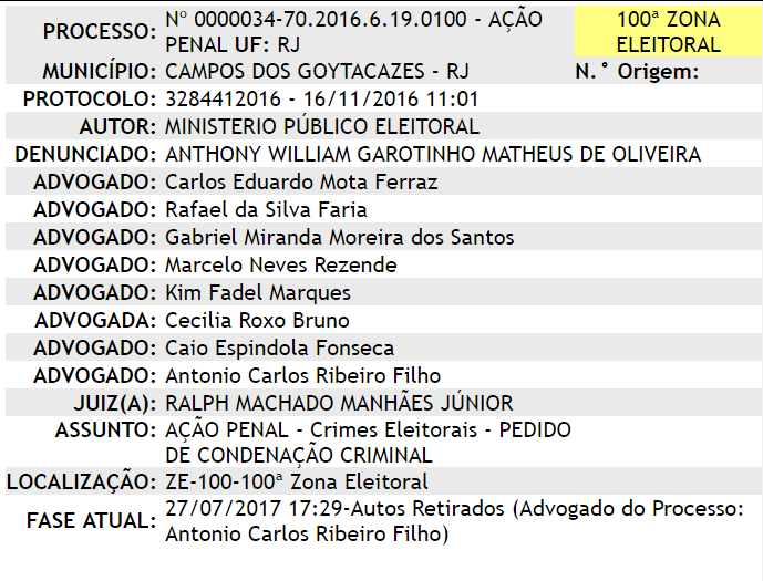 Depois de ter ficado com o processo físico entre os dias 17 e 26 de julho, no dia 27 a defesa, através do advogado Antonio Carlos Ribeiro Filho retirou do cartório, mais uma vez, os autos.