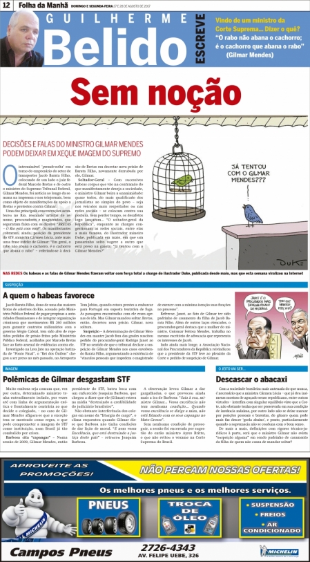 Soltador-Geral – Com sucessivos habeas corpus que vão na contramão do que manifestamente deseja a sociedade, o ministro Gilmar beira a unanimidade: quase todos, do mais qualificado dos jornalistas ao simples do povo – seja nos veículos mais respeitados ou nas redes sociais – se colocam contra sua postura. Sem perder tempo, os desafetos logo lançaram... “O soltador-geral da República”, enquanto as charges congestionam as redes sociais, entre elas a mais famosa, do ilustrador mineiro Duke, publicada em maio, em que um passarinho solto sugere a outro que está preso na gaiola: “Já tentou com o Gilmar Mendes?”