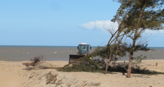 O serviço de desobstrução da avenida Atlântica, em Atafona, era mais que esperado pelos moradores e veranistas daquela região. Há anos a areia estava acumulada na pista, impedindo a passagem de veículos e até invadindo algumas residências. O que ninguém esperava era que em troca deste benefício, seriam sacrificadas algumas das famosas casuarinas. Na tarde desta segunda-feira (4), um máquina da empresa União, que presta serviço para a Prefeitura de São João da Barra, ao mexer na areia da praia derrubou as árvores, como mostram as imagens recebidas pelo blog. Somente nesta segunda foram, pelo menos, três árvores, com cerca de seis metros cada.