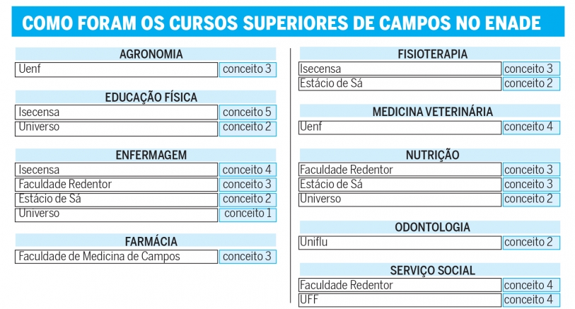 O resultado do Exame Nacional de Desempenho de Estudantes (Enade) 2016, que avalia o rendimento dos estudantes dos cursos de graduação foi divulgado pelo Instituto Nacional de Estudos e Pesquisas Educacionais Anísio Teixeira (Inep). Em Campos há alguns destaques positivos como o Isecensa, a Universidade Estadual do Norte Fluminense (Uenf) e Faculdade de Medicina (FMC). De 4,3 mil graduações que passaram pelo crivo do governo, 27% tiveram nota 1 e 2, consideradas insatisfatórias, entre elas está o Uniflu, no curso de Odontologia, e também outras universidades. O resultado foi divulgado no blog Ponto de Vista, de Christiano Abreu Barbosa e hospedado na Folha 1.