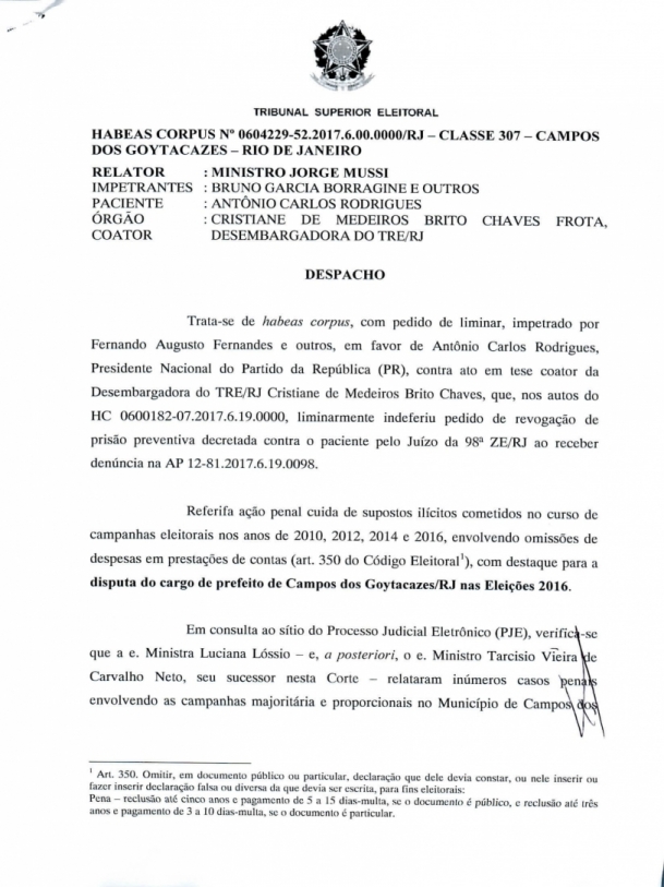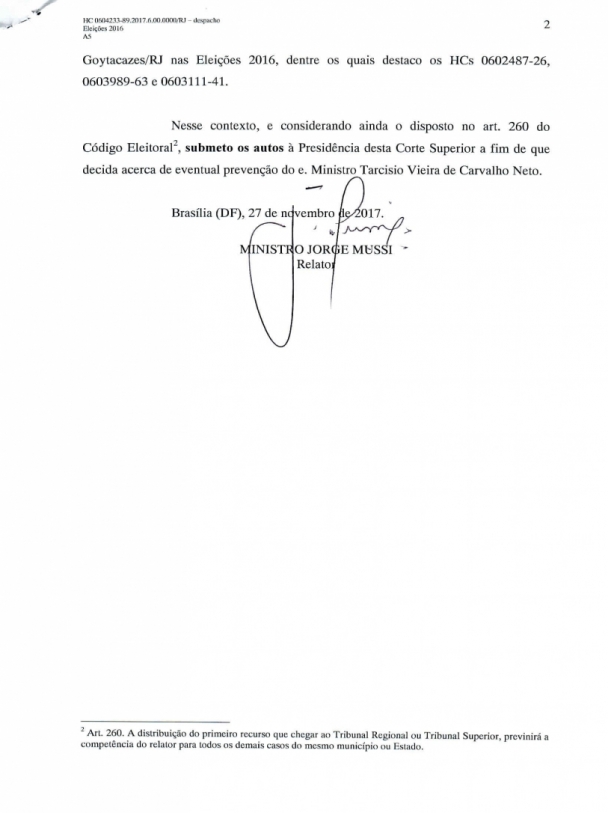Diz Mussi: “Em consulta ao sítio do Processo Judicial Eletrônico (PJE), verifica-se que a e. Ministra Luciana Lóssio - e, a posteriori o e. Ministro Tarcísio Vieira de Carvalho Neto, seu sucessor nesta Corte - relataram inúmeros casos penais envolvendo as campanhas majoritária e proporcionais no Município de Campos dos Goytacazes nas Eleições de 2016...“Nesse contexto, e considerando, ainda, o disposto no art. 260 do Código Eleitoral2 submeto os autos à Presidência desta Corte Superior a fim de que decida acerca de eventual prevenção do e. Ministro Tarcísio Vieira de Carvalho Neto”.
