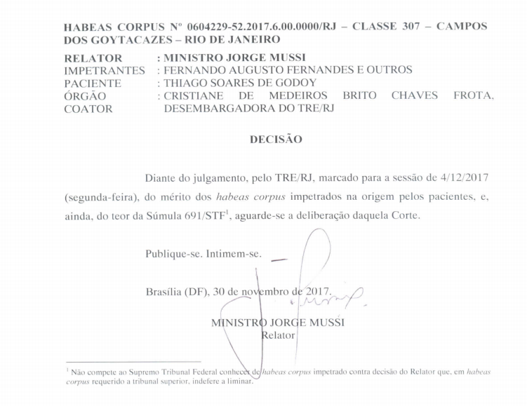 O ministro do Tribunal Superior Eleitoral (TSE) Jorge Mussi vai esperar julgamento dos habeas corpus pelo plenário do Tribunal Regional Eleitoral (TRE) dos réus no caso Caixa d'água. O julgamento deve acontecer semana que vem.