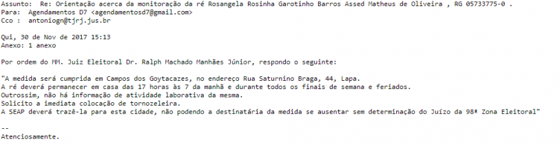O Tribunal Regional Eleitoral comunicou, na noite desta quinta-feira, ao juiz Ralph Manhães, da 98ª Zona Eleitoral de Campos, que as medidas alternativas impostas à ex-governadora Rosinha Garotinho serão cumpridas no município do Rio de Janeiro.