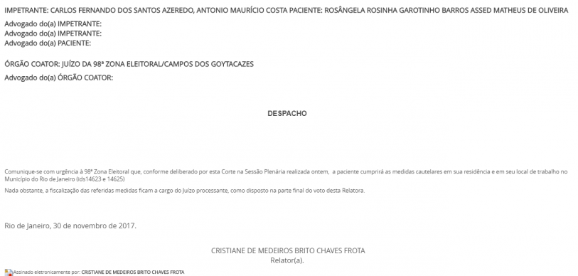 Em resposta ao setor de monitoramento que cuida da colocação e acompanhamento de tornozeleiras eletrônicas, o juiz Ralph Manhães determinou que a ex-prefeita Rosinha Garotinho passe a cumprir em Campos as medidas restritivas que foram impostas pelo plenário do TRE. As medidas foram impostas em substituição à prisão preventiva que ela cumpria desde quarta-feira da semana passada (22).
