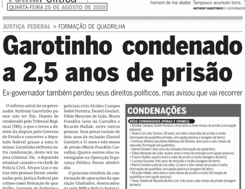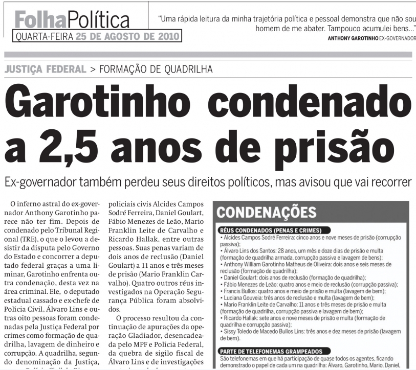 Em 2010, Garotinho foi condenado pela Justiça Federal por formação de quadrilha armada, junto com o deputado estadual cassado e ex-chefe de Polícia Civil, Álvaro Lins e outras oito pessoas. A quadrilha, segundo denominação da Justiça, usou a Polícia Civil do Rio para cometer os crimes como corrupção e lavagem de bens. A Justiça atestou a prática de crimes como facilitação de contrabando (a exploração de caça-níqueis pelo grupo do bicheiro Rogério Andrade não era reprimida), além de corrupção ativa e passiva.