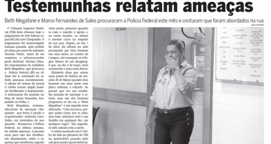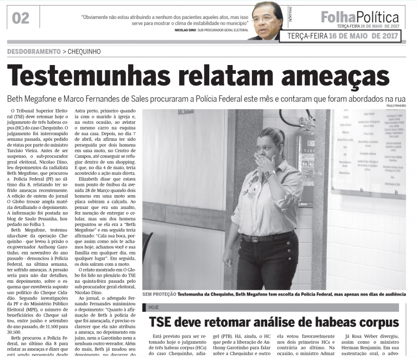 Desde setembro de 2016, quando começou a operação Chequinho, diversas foram as testemunhas que relataram ameaças. Em maio último, Beth Megafone, testemunha-chave da Chequinho, denunciou à PF ter sofrido ameaças em três ocasiões. A ação mais direta teria acontecido no dia 4 de maio, a ação mais direta: Beth disse que estava num ponto de ônibus da avenida 28 de Março quando dois homens em uma moto sem placa subiram a calçada. Ao pensar que era um assalto, fez menção de entregar o celular, mas um dos homens perguntou se ela era a “Beth Megafone” e em seguida teria afirmado: “Cala sua boca, porque assim como nós te achamos hoje, achamos você e sua família em qualquer dia, em qualquer lugar”.