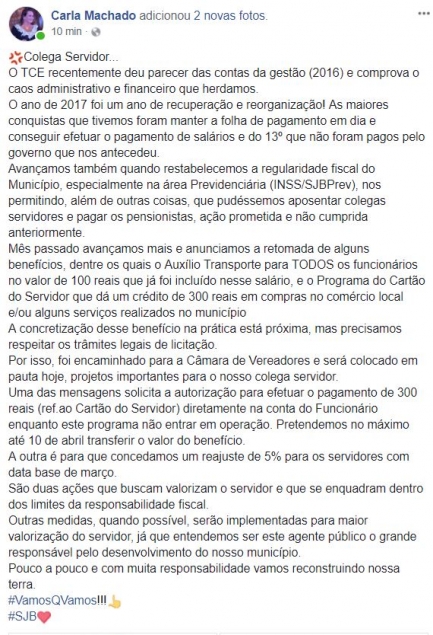 Na mensagem aos servidores, Carla cita o “caos administrativo” herdado da gestão anterior, observando que o recente parecer do Tribunal de Contas do Estado do Rio de Janeiro, que reprovou as contas do ex-prefeito Neco (PMDB), comprova a situação.“ O ano de 2017 foi um ano de recuperação e reorganização”, salientou a prefeita.