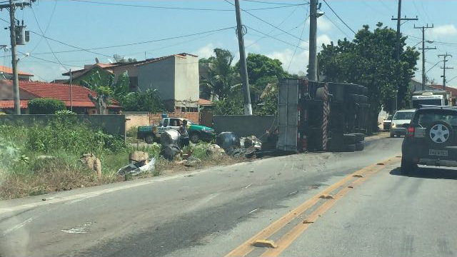 A carroceria vazia de um caminhão tombou na BR 356, na altura de Barcelos, distrito de São João da Barra, no início da tarde desta quarta-feira (14). O veículo ainda atingiu um poste e chegou a derramar óleo na rodovia, que chegou a ficar em meia pista. Apesar do ocorrido, ninguém ficou ferido.