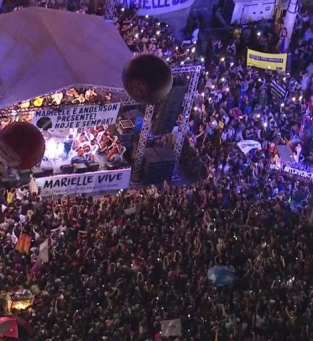 Nesta terça-feira, por volta de 17h30, manifestantes se concentraram na Candelária, no centro do Rio de Janeiro, para um ato em memória da vereadora Marielle Franco (PSOL) e do motorista Anderson Gomes, assassinados no último dia 14, e depois seguiram para uma cerimônia ecumênica na Cinelândia, também na área central.