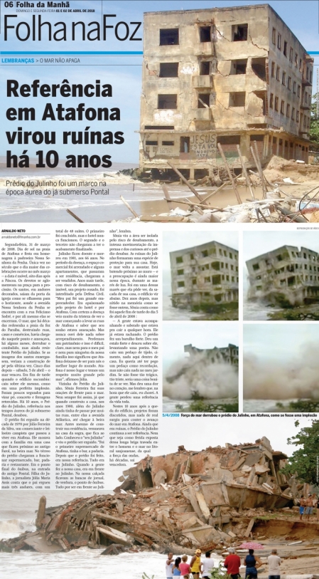 Segunda-feira, 31 de março de 2008. Dia de sol na praia de Atafona e festa em homenagem à padroeira Nossa Senhora da Penha. Única vez no século que o dia maior das celebrações ocorre no mês março — a data é móvel, oito dias após a Páscoa. Os devotos se aglomeravam na praça para a procissão. Os santos, em andores decorados, saíam da porta da igreja como se olhassem para o horizonte, aonde a avenida Nossa Senhora da Penha se encontra com a rua Feliciano Sodré, e por ali mesmo elas se encerram. O mar, que há décadas redesenha a praia da foz do Paraíba, destruindo ruas, casas e comércios, havia chegado naquele ponto e ameaçava, há alguns meses, derrubar o combalido, mas ainda resistente Prédio do Julinho. Se as imagens dos santos enxergassem, veriam a construção de pé pela última vez. Cinco dias depois — sábado, 5 de abril — o mar venceu. Era fim de tarde quando o edifício sucumbiu: caiu sobre ele mesmo, como em uma perfeita implosão. Foram poucos segundos para virar pó, concreto e ferragens retorcidas. Há 10 anos, o Prédio do Julinho, referência nos tempos áureos do já submerso Pontal, desabou.
