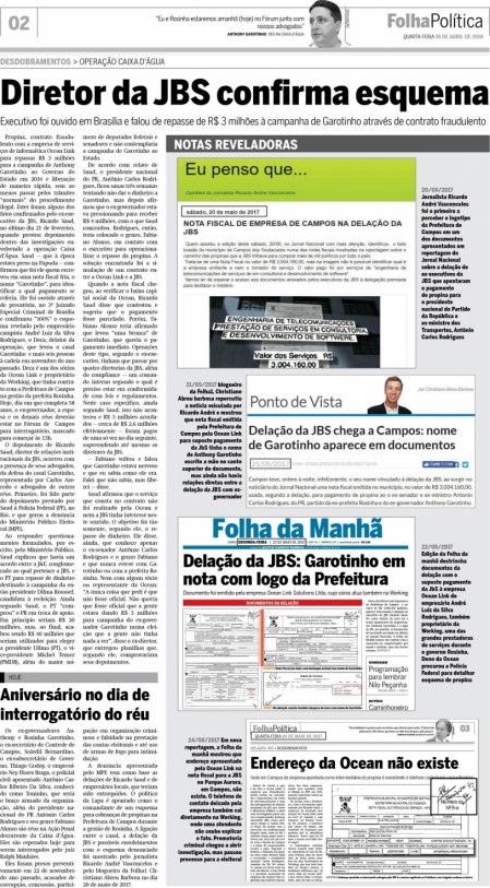 Propina, contrato fraudulento com a empresa de serviços de informática Ocean Link para repassar R$ 3 milhões para a campanha de Anthony Garotinho ao Governo do Estado em 2014 e liberação de maneira rápida, sem ao menos passar pelos trâmites “normais” do procedimento ilegal. Estes foram alguns dos fatos confirmados pelo ex-executivo da JBS, Ricardo Saud, no último dia 21 de fevereiro, quando prestou depoimento dentro das investigações envolvendo a operação Caixa d’Água. Saud — que à época estava preso na Papuda — confirmou que foi ele quem escreveu em uma nota fiscal fria, o nome “Garotinho”, para identificar a qual pagamento se referia. Ele foi ouvido através de precatória, no 3º Juizado Especial Criminal de Brasília e confirmou “100%” o esquema revelado pelo empresário campista André Luiz da Silva Rodrigues, o Deca, delator da operação, que levou o casal Garotinho e mais seis pessoas à cadeia em novembro do ano passado. Deca é um dos sócios da Ocean Link e proprietário da Working, que tinha contrato com a Prefeitura de Campos na gestão da prefeita Rosinha. Hoje, dia em que completa 58 anos, o ex-governador, a esposa e os demais réus deverão estar no Fórum de Campos para interrogatório, marcado para começar às 13h.