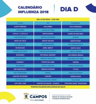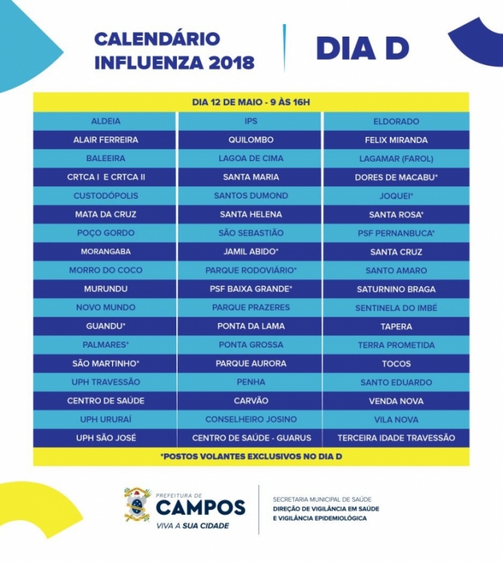 Os postos volantes vão funcionar entre 8h e 17h nas Unidades Básicas de Saúde (UBS) dos bairros Jockey, Santa Rosa, Jamil Abido, Guandu, Dores de Macabu, Parque Rodoviário, São Martinho e Palmares, e nas unidades do Programa Saúde da Família (PSF) de Pernanbuca e Baixa Grande.