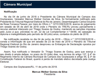 O Diário Oficial desta sexta-feira (15) traz notificação da Câmara de Campos ao suplente de vereador Thiago Godoy (PR) sobre a decisão do TRE que o afastou do cargo após ter sua condenação na Chequinho confirmada em segunda instância. Ele terá três dias para exercer seu direito à ampla defesa. Depois será convocado o suplente. A próxima da lista é Roberta Moura, também já condenada na Chequinho. Em seguida vem Eduardo Crespo, quinto suplente e que obteve 907 votos.
