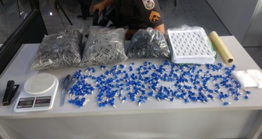 Uma equipe da PM fazia patrulhamento pela região no momento em que viu os dois agindo de forma suspeita. Eles foram abordados e depois de uma revista, os militares encontraram as drogas. Foram apreendidos cerca de 3000 pinos vazios, 321 pinos de cocaína, tesoura e balança de precisão.
