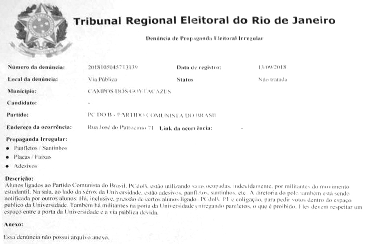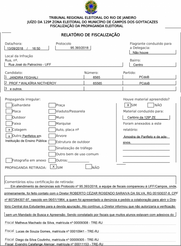 A Justiça Eleitoral realizou no último dia 13, no campus da Universidade Federal Fluminense (UFF) de Campos, uma ação de fiscalização, inclusive com a presença do chefe da fiscalização eleitoral na comarca, juiz Ralph Manhães, após o recebimento de denúncia anônima: