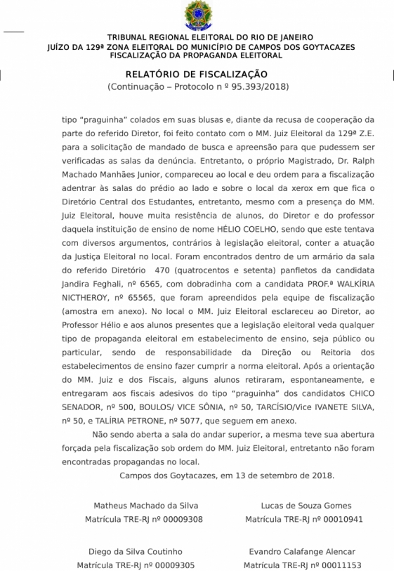 A primeira denúncia que chegou ao TRE foi confirmada. Abaixo, o relatório da equipe de fiscalização que esteve na universidade no dia 13: