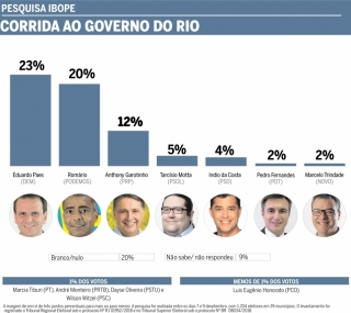 Na primeira pesquisa Ibope divulgada depois do início do horário eleitoral na TV e no rádio, os candidatos Eduardo Paes (DEM) e Romário (Podemos) aparecem tecnicamente empatados na disputa pelo Governo do Estado. O ex-prefeito do Rio aparece com 23% das intenções de voto contra 20% do senador. Os dois foram os únicos que cresceram acima da margem de erro, que é de três pontos percentuais para mais ou para menos. Na última pesquisa, realizada entre os dias 17 e 20 de agosto, Romário aparecia com 14% das intenções de voto, seguido por Paes, que tinha 12%. Anthony Garotinho (PRP) aparece nesse levantamento com os mesmos 12% que tinha na pesquisa anterior.