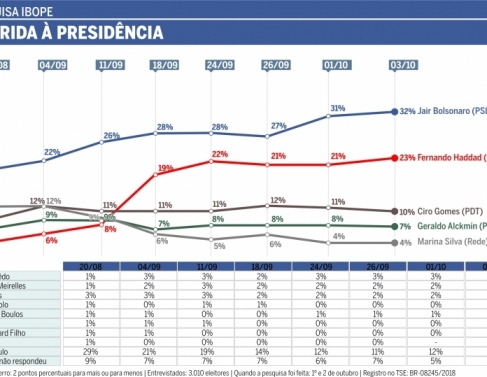Em relação ao levantamento anterior do instituto, divulgado segunda-feira (1º), Bolsonaro subiu um ponto percentual, Haddad, dois pontos, Ciro foi de 11% para 10%; Alckmin foi de 8% para 7%; Marina se manteve com 4%. Os indecisos foram de 5% para 6% e os brancos ou nulos, de 12% para 11%.