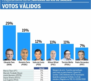 Nos votos válidos, quando são excluídos brancos e nulos, Paes soma 29%; Romário, 19%; Indio, 12%; Witzel e Tarcísio, 11%; Pedro, 7%; Tiburi, 6%; Trindade, 2%; Monteiro e Dayse, 1%; e Eugenio, 0%.