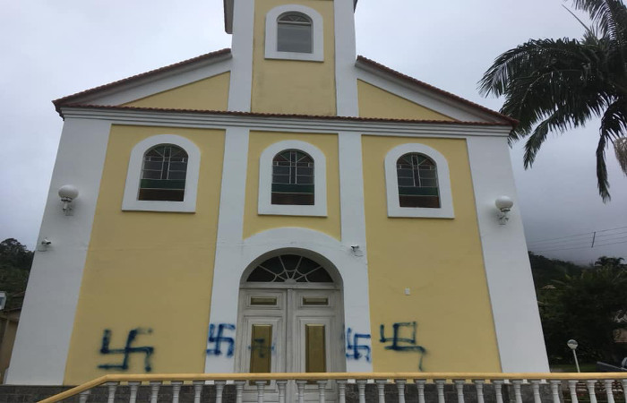 As pichações foram feitas na madrugada do último domingo e, além de parte da fachada, uma das portas principais foi atingida. Nessa quarta-feira, uma limpeza foi feita no templo.