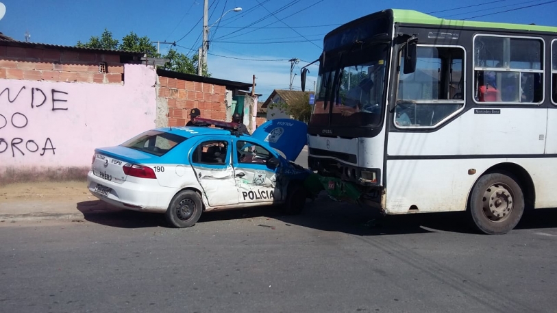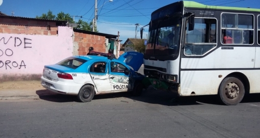 Dois policiais militares ficaram feridos após colisão envolvendo uma viatura e um ônibus, no cruzamento das ruas Gizete Pontes e Paraíba do Sul, no Parque Eldorado, em Guarus. O acidente ocorreu por volta das 17h. Os dois militares foram encaminhados para o Hospital Ferreira Machado (HFM) com ferimentos leves. Não houve feridos no ônibus.