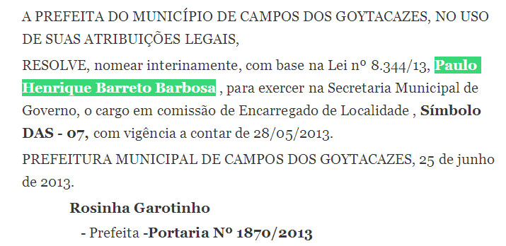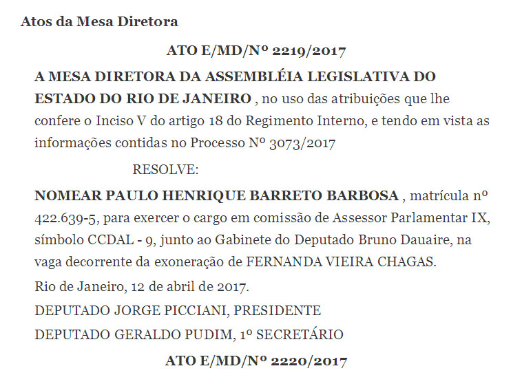 O detalhe é que o cabo eleitoral “PH”, Paulo Henrique Barreto Barbosa, foi nomeado em 25 de junho de 2013 e atuou como DAS 7 no governo de Rosinha Garotinho, mãe de Wladimir e, posteriormente, foi nomeado, em 12 de abril de 1017, como assessor parlamentar no gabinete do deputado Bruno Dauaire, que foi chefiado por Wladimir Garotinho.