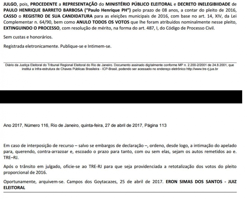 Além disso, “PH” foi candidato a vereador em 2016, não se elegendo, mas fazendo parte do grupo dos 34 investigados na “Operação Chequinho” que desbaratou o escandaloso esquema de compra de votos nas eleições de 2016, sendo condenado pelo Juiz Eleitoral Eron Simas dos Santos a 8 anos de inelegibilidade por envolvimento naquele esquema de compra de votos.